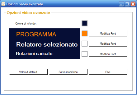 Dalla schermata "Impostazioni video avanzate" è possibile modificare il colore di sfondo così come colore, dimensione e font delle scritte visualizzate , in modo da armonizzarli con lo sfondo congressuale o coi colori aziendali
